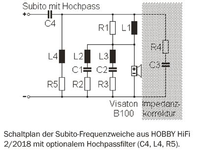 Für den Minimonitor “Subito”, bestückt mit Visatons exzellentem 10-cm-Breitbänder B100, haben wir zwecks Kombination mit einem Subwoofer ein optionales Hochpassfilter entworfen. Die für